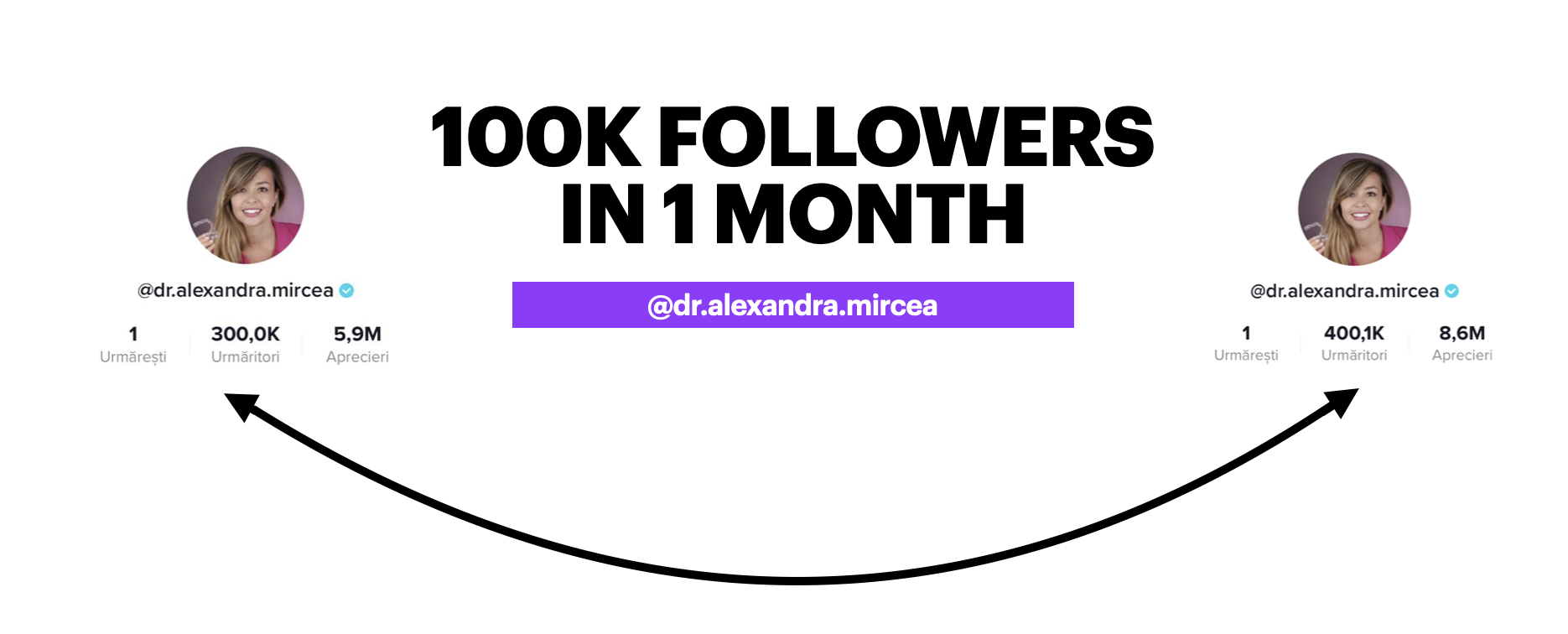 Cea mai impresionantă creștere am avut-o cu contul @dr.alexandra.mircea, cu care am reușit să fim nr 1 în trending timp de 2 săptămâni cu 3 clipuri diferite. Astfel am crescut de la 300K de urmăritori la 400K într-o singură lună.